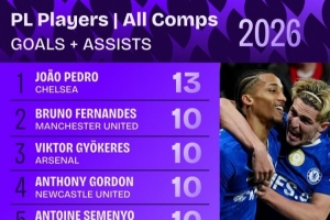 体育资讯3月8日讯 Squawka统计了2026年英超球员各赛事参与进球数量,并列出榜单,若昂·佩德罗参与13球居首,B费、约克雷斯、戈登、塞梅尼奥参与10球。